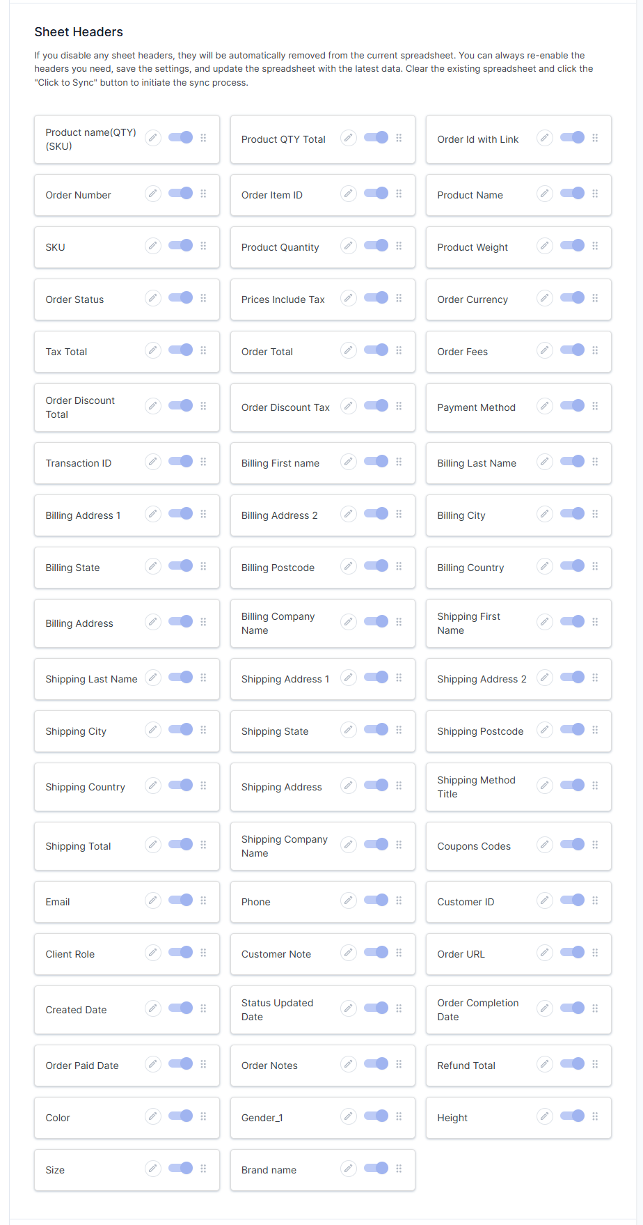 - Enable Sheet Headers whose details you want to be recorded in the sheet ( like: Product Name, Order Total, Customer Name, etc.).
