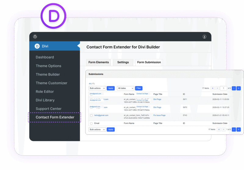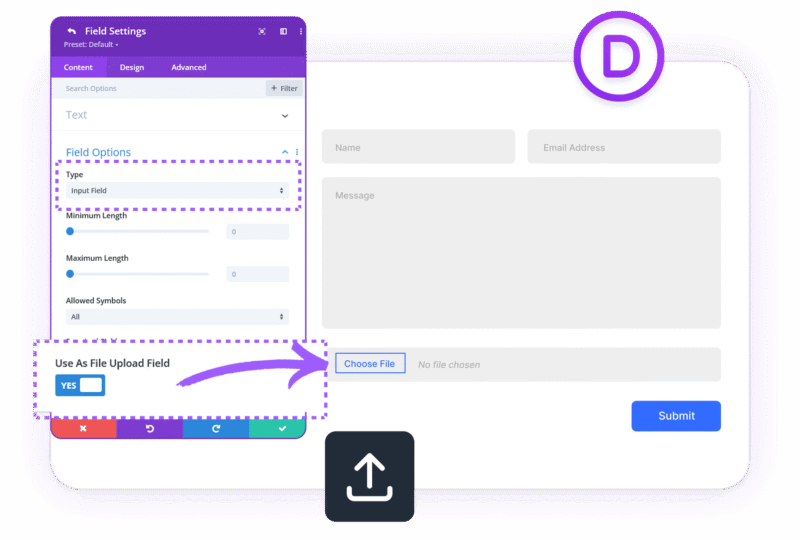 Enhance Divi contact form module with file upload field, save form submissions in database, and other advanced form features.